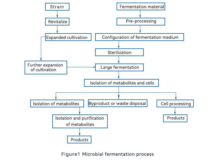 The basic process of microbial fermentation is shown in the following diagram, which mainly includes the following contents.①Preparation of culture medium for culturing strains and expanding production of fermenters.