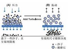 (A)對混合物施加直接的壓力,使得底部砂粒落下;在篩網(wǎng)表面形成一個鵝卵石層,阻礙頂部砂粒向篩網(wǎng)方向移動并通過篩網(wǎng)。