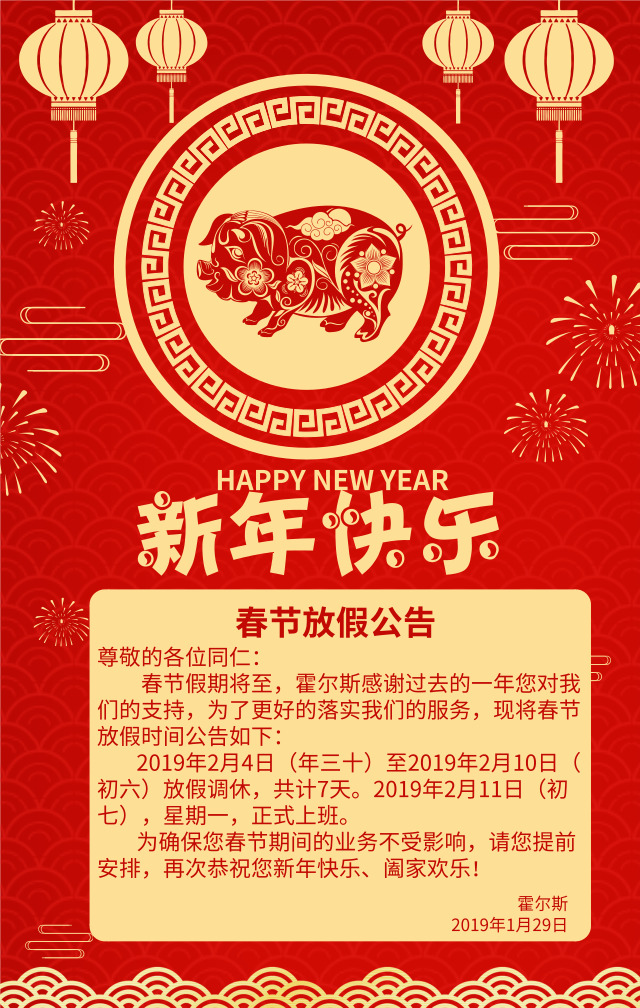 您現(xiàn)在閱讀的文章是:霍爾斯2019年春節(jié)放假公告。