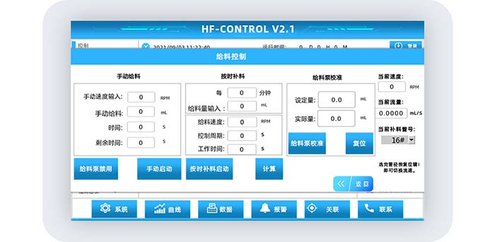 設(shè)置手動(dòng)補(bǔ)料時(shí)補(bǔ)料泵的轉(zhuǎn)速,加入的料液體積,啟動(dòng)后系統(tǒng)可計(jì)算出定速定量后補(bǔ)料泵所需工作的時(shí)間,以及顯示補(bǔ)料泵剩余的工作時(shí)間。