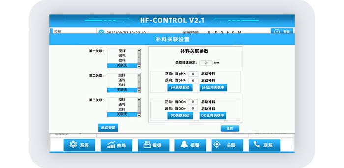 在發(fā)酵過程中,輸入所需的關(guān)聯(lián)轉(zhuǎn)速,以及補(bǔ)料正向關(guān)聯(lián)DO或補(bǔ)料反向關(guān)聯(lián)DO的條件,系統(tǒng)即可進(jìn)行補(bǔ)料關(guān)聯(lián)DO,進(jìn)行多重調(diào)節(jié)DO,滿足客戶多樣需求。